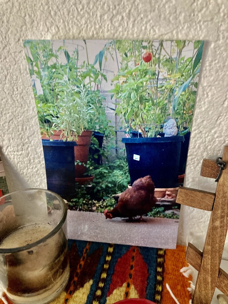 I spent the better part of an hour this morning searching for this photograph of a chicken. It wasn’t in the drawer where I thought it should be, and so I ripped apart a closet, and finally found it in the bottom of a shoe box on the top shelf. Without it, my All Saints’ altar would be incomplete. I took this photo a number of years ago on a sunny afternoon I spent with another friend. She was in her final days, and had reminisced about growing up around barnyard animals. So, I had the great idea to borrow this chicken (Gloria) and take her to my her to my friend’s patio on a visit. Watching my friend marvel at Gloria as she searched for insects was one of most joyful experiences of my life so far.